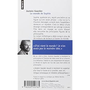 Roman Tout commence le jour où Sophie Amundsen, une jeune fille de quinze ans, trouve dans sa boîte une lettre qui lui est adressée, et sur laquelle n'est inscrite qu'une seule phrase : "Qui es-tu ?". Une seconde enveloppe lui parvient, et à l'intérieur un nouveau petit mot : "d'où vient le monde ?". L'expéditeur de ces lettres reste un mystère, mais les questions posées intriguent Sophie. C'est le début d'une étrange correspondance qui va plonger la jeune fille en quête de réponses dans une longue visite des principales figures de la philosophie... Ce roman initiatique a conquis des millions de lecteurs à travers le monde. Sans doute parce que Le monde de Sophie ne donne pas de réponses pré-fabriquées mais parce qu'il pose des questions, de vraies questions.